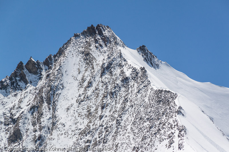 Aber natürlich analysieren wir auch den Grat hinauf zum Nadelhorn. Sieht durchaus machbar aus, aber erstens ist es schon sehr spät und zweitens haben wir auch schon über 1300 Höhenmeter in den Beinen. Wer weiß, ob wir "da oben" noch ausreichend konzentriert wären...