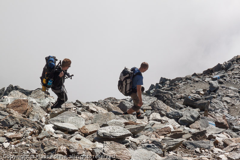 Meine beiden Seilpartner beim Abstieg. Wegen meiner Knieprobleme muss ich deutlich langsamer gehen. Überhaupt erstaunlich, dass sich die Knieschmerzen nach drei Wochen in den Alpen noch sehr in Grenzen halten. Da hatte ich vorher ziemliche Befürchtungen. Jetzt stehen ja "nur" noch die 1500 Höhenmeter bis Saas Fee an...