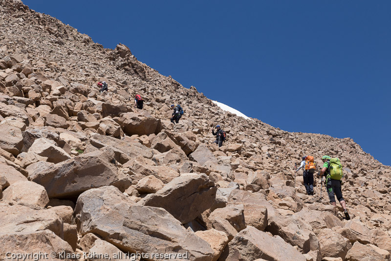 Dann geht es zur Sache: Ein steiles Blockfeld erfordert Konzentration. Einmal böse umknicken und man könnte den Ararat unter Umständen schon vergessen.