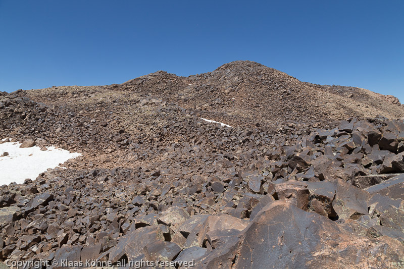 Um kurz nach zwölf erreiche ich den Kraterrand. Offenbar geht es rechts hoch zu dem großen Schutthaufen.