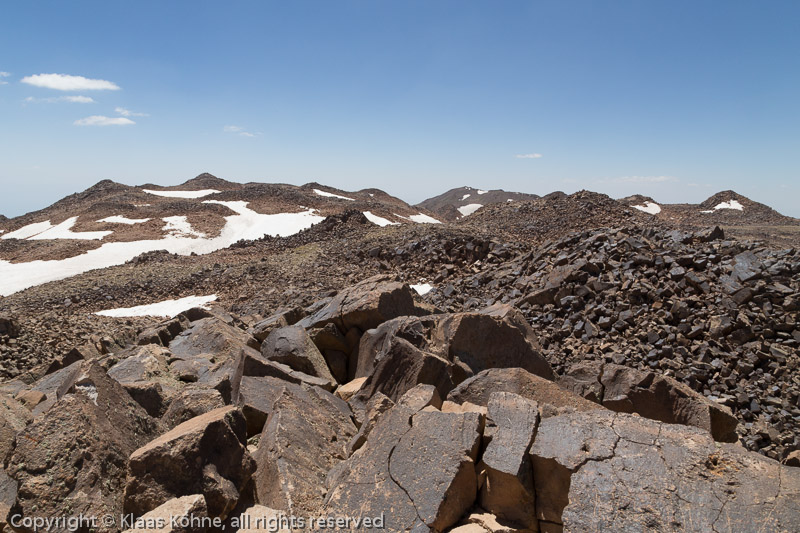 Nerviges Auf und Ab im Blockgelände, dann bin ich um 12h50 oben. Tja, aber ist das hier der tatsächliche Gipfel? Da gibt es mindestens noch drei andere Buckel, die dafür in Frage kommen. Mark hatte mich ja gewarnt...