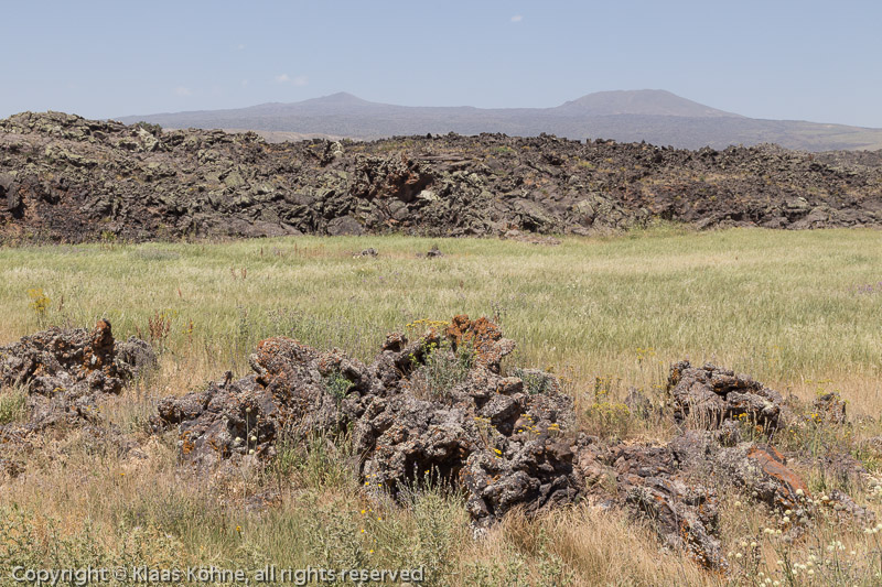 Links neben der Straße tauchen Lavaformationen auf. Und am Horizont ein Vulkan.