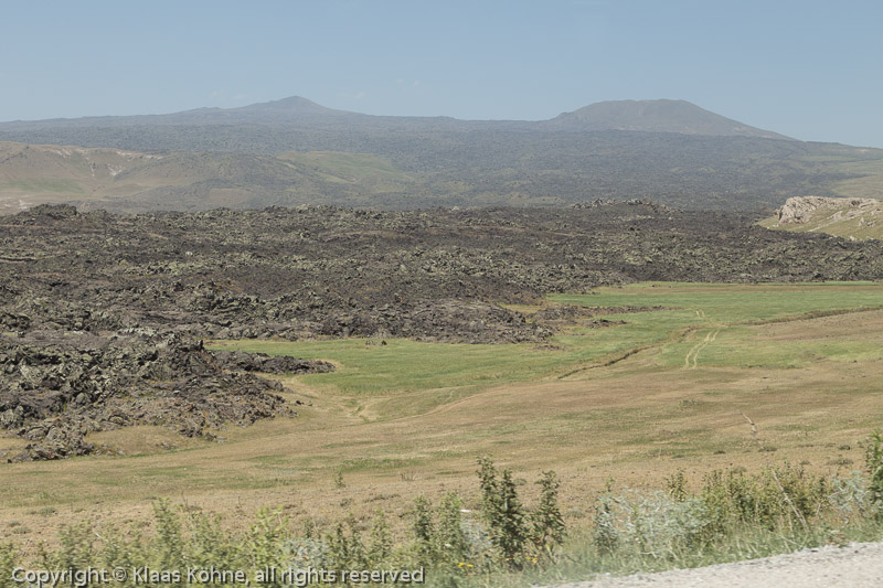 Wir haben das riesige Lavafeld des Vulkans Tendürek (3533m, hinten rechts) erreicht, des aktivsten Vulkans der Türkei.