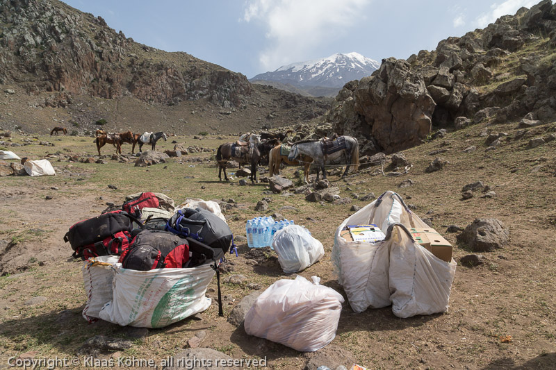 Wir fahren auf relativ guter Piste bis auf etwa 2200m. Dort warten schon die Tragtiere (und im Hintergrund der Gipfel).
