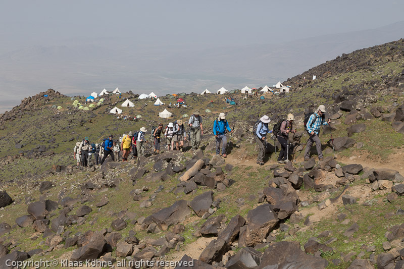 Kurz nach neun geht es los. Eine größere amerikanische Gruppe steigt mit uns auf. Mit dabei (im gelben Hemd) ist Gary Neptune, den ich von einem Buch her kenne und der schon 1983 auf dem Everest war. Später komme ich noch kurz mit ihm in´s Gespräch. Sehr nett, der Typ!