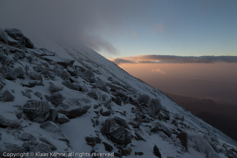 Es wird heller, aber es stürmt weiterhin heftig. Außerdem klettern wir jetzt in einen Wolkendeckel hinein, der den Gipfelbereich umgibt. Ich schätze, dass wir jetzt auf etwa 4800m sind.