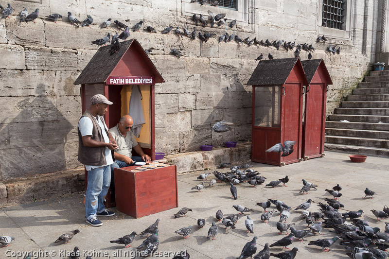 Am Basarausgang steht man schon fast vor der Yeni Camii, der "Neuen Moschee". An der Außenwand gibt´s Futternachschub für die Tauben.