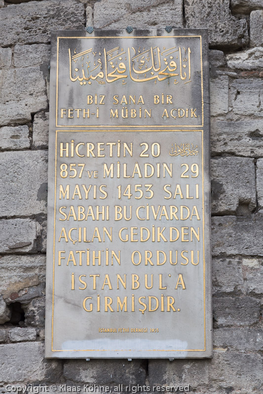 Diese Tafel erinnert daran. Ich frage mich, wie es wohl mit Konstantinopel weitergegangen wäre, wenn die Mauer damals dem Ansturm der Osmanen standgehalten hätte...