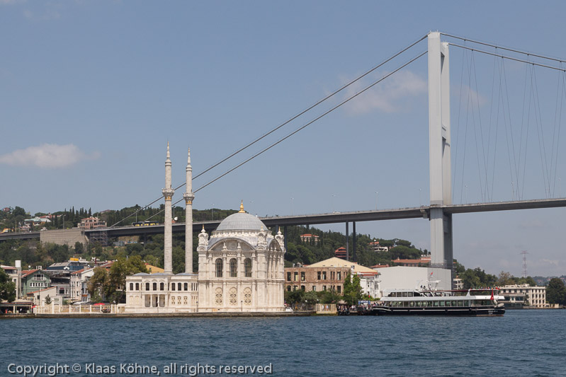 Ortaköy und die riesige Bosporus-Brücke. Die Moschee wirkt dagen fast wie ein Spielzeug.