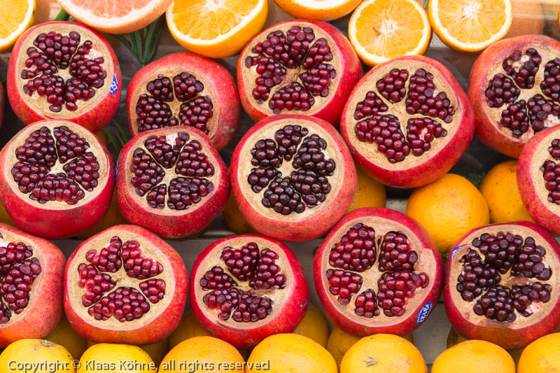 Granatäpfel und Orangen. Ich erinnere mich an meinen wenig eleganten Versuch in Marrakesch, einen Granatapfel zu essen...