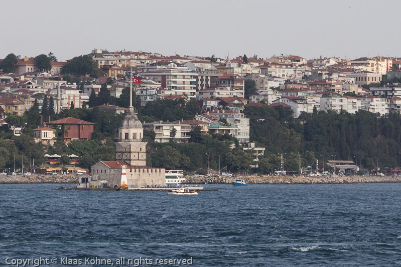 Auf einer Bosporusfähre geht´s rüber nach Üsküdar in Asien. Zwar kann man mittlerweile auch per U-Bahn dorthin, aber per Schiff ist es natürlich viel reizvoller. Im Bild der Kiz Kulesi, das Wahrzeichen von Üsküdar.