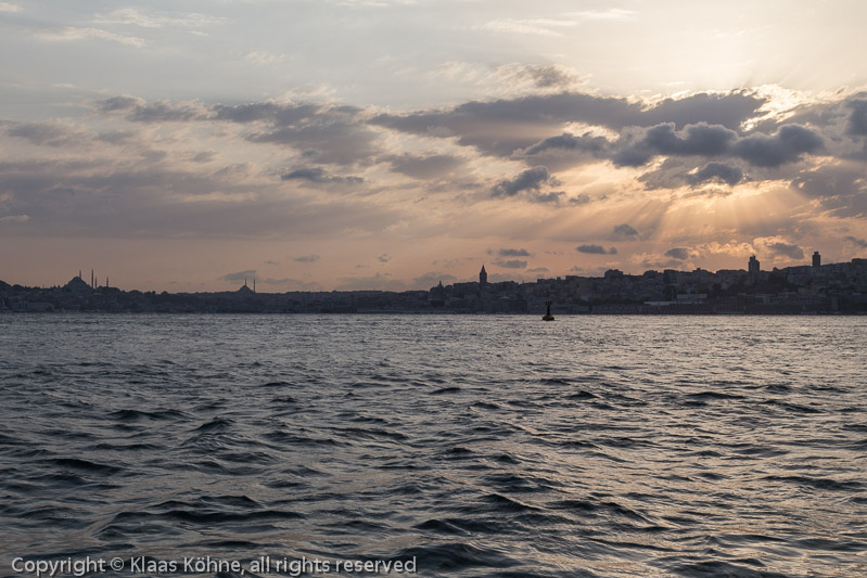 Abendstimmung über der Stadt. Links die Süleymaniye-Moschee, rechts von der Bildmitte der Galata-Turm.