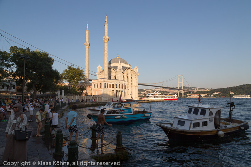 Hübscher Blick auf die Moschee von Ortaköy und die riesige Atatürk-Brücke über den Bosporus