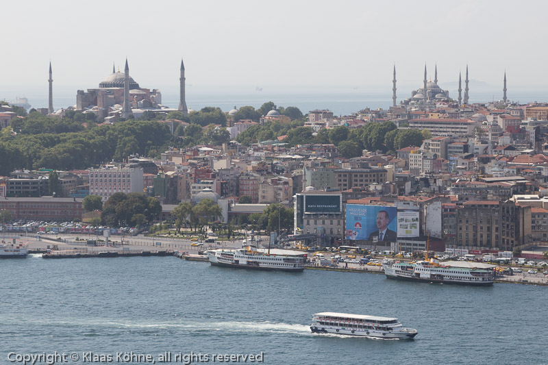 Im Vordergrund der Stadtteil Sirkeci, im Hintergrund die Hagia Sophia (links) und die Blaue Moschee (rechts)
