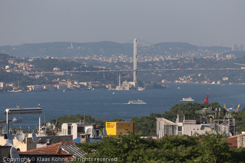 In der Ferne die die erste Bosporusbrücke zu erkennen, die (nicht wirklich überraschend) auch "Atatürk-Brücke" heißt und aus dem Jahr 1973 stammt. Ganz klein davor die bekannte Moschee von Ortaköy.