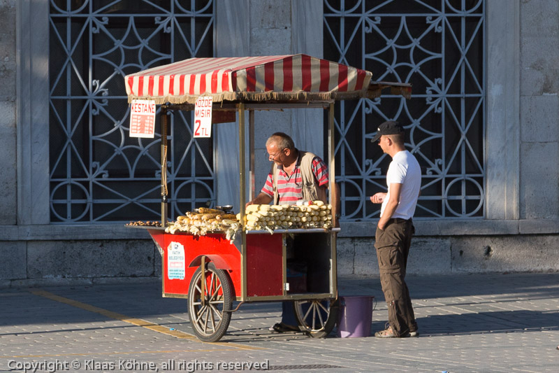 Geröstete Maiskolben und Kastanien warten auf ihre Abnehmer.