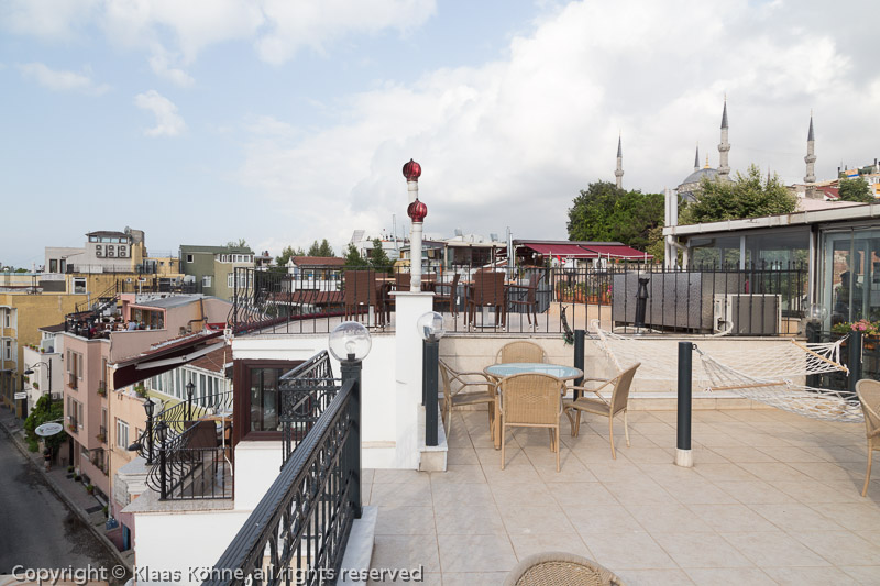 Am nächsten Morgen: Frühstück auf der Dachterrasse mit Blick auf die Blaue Moschee