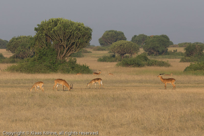 Ruhig grasende Uganda-Kobs vor Baumkakteen. Keine Gefahr. Keine Gefahr?