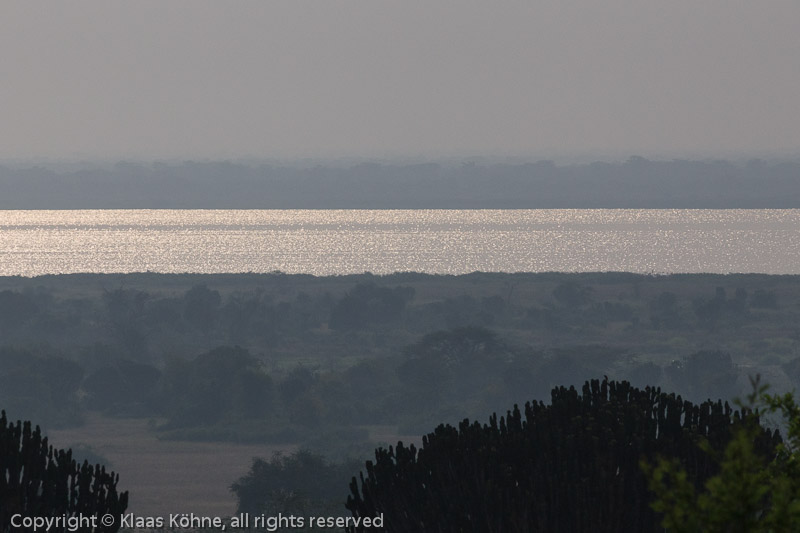 Der Kazinga Channel, eine natürliche Verbindung zwischen Lake Edward und Lake George, schimmert in der Morgensonne.