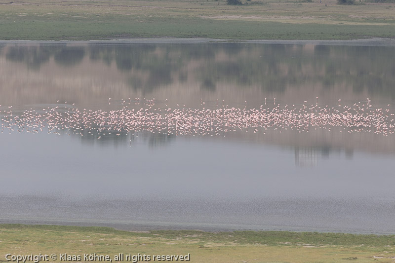 Hübsche rosa Flamingo-Flöckchen auf dem See. Leider kommt man nicht näher ran.