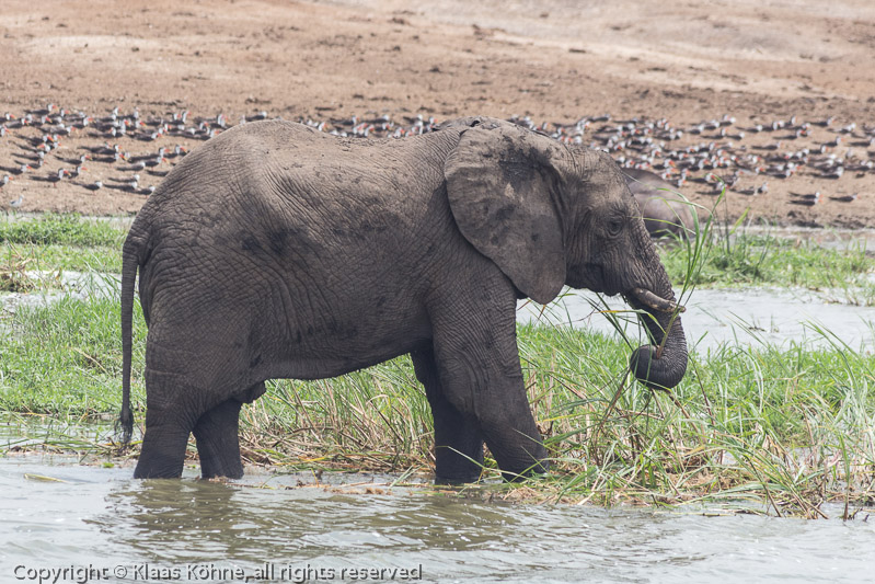 Dieser eindrucksvolle Vertreter der Gattung Loxodonta africana eröffnet die Tierparade am Flussufer.