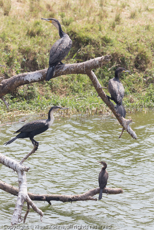 Diese Weißbrust-Kormorane (Phalacrocorax carbo) warten auf Fisch.