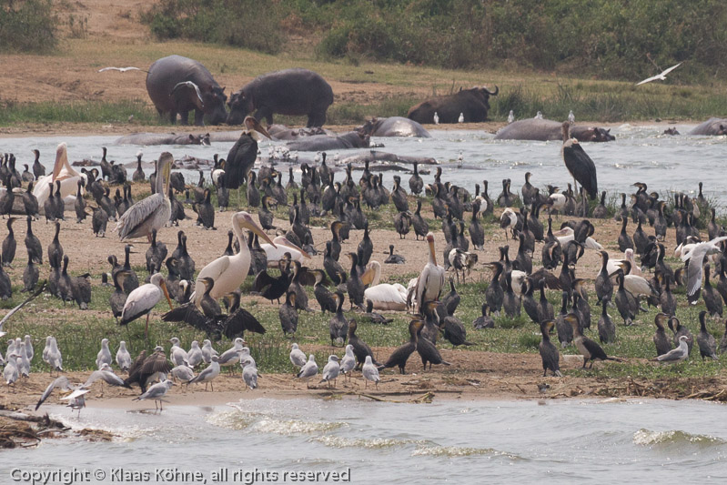 Langsam gleiten wir auf eine größere Vogelkolonie zu. Im Hintergrund wieder Flusspferde und Büffel.