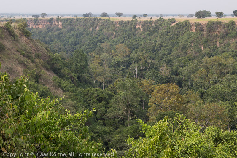 Nach einer knappen Stunde Fahrzeit kommen wir an der tief in die flache Savanne eingekerbten Kyambura-Schlucht an.