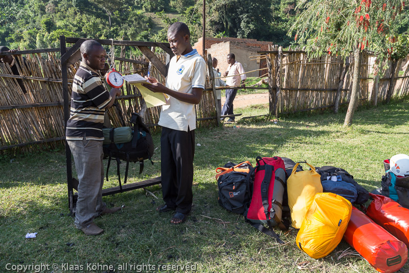 Das Gepäck wird gewogen, damit alles seine Ordnung hat. Bei mir kommen 22kg auf den Rücken. Die restlichen 8kg (im roten Rucksack) werden von einem der Träger übernommen. PS: Gelände- und verletzungsbedingt hat sich das Verhältnis selbstgetragene Kilos / fremdgetragene Kilos bis zum Ende der Tour mehr als umgekehrt...