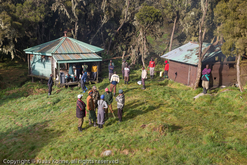 Am Morgen des dritten Trekkingtages bei der John Matte Hut: Guides und Träger bereiten sich auf die heutige Etappe zur Bujuku Hut vor.