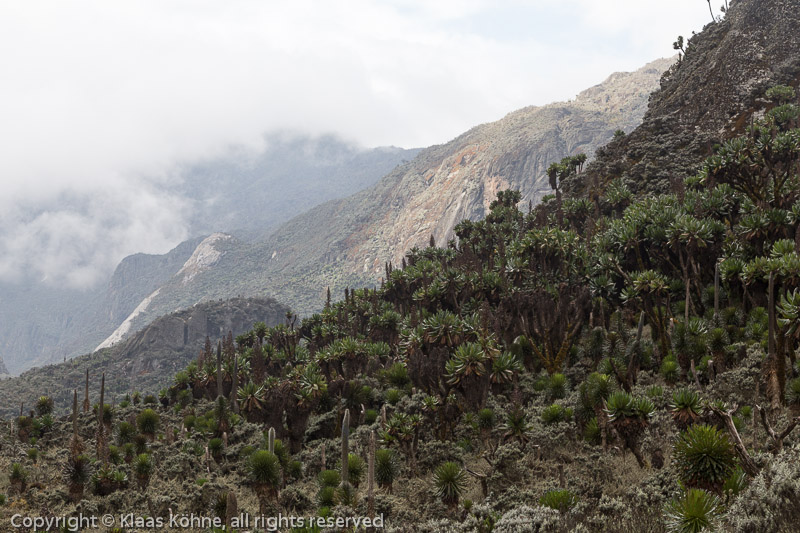 Nach ungefähr einer Stunde habe ich den Stuhlmann-Pass auf 4160m erreicht. Der Blick geht hinunter Richtung Kongo.