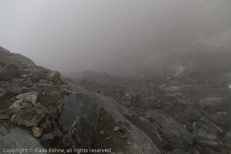 30.12.2013 - Gipfeltag!? Mein Schädel hat sein OK gegben, offenbar habe ich mir keine Gehirnerschütterung zugezogen. Gegen halb fünf brechen Heiko, Marcus, Tobias und ich zusammen mit vier Guides bei ziemlich dickem Nebel auf. Leider entschließen sich die drei anderen dazu, nicht mitzukommen, sondern gleich zu Kitandara Hut abzusteigen. Wenn alles nach Plan läuft, werden wie sie dort heute abend wiedersehen. Zuerst geht es über einen steilen, teilweise seilgesicherten Felshang hoch, bis wir nach etwa einer Stunde den unteren Rand des Stanley-Plateaus erreichen. Dort seilen wir uns (langwierig!) an und queren ein Stück auf dem Gletscher. Danach geht es wieder auf Felsen weiter. Zunächst ein gutes Stück abwärts und dann unterhalb des Alexandra-Ostgrates wieder schräg aufwärts. Die Route hat nicht mehr viel mit dem Weg früherer Besteiger zu tun und wird offenbar ständig dem aktuellen Stand des Gletscherrückgangs angepasst.
