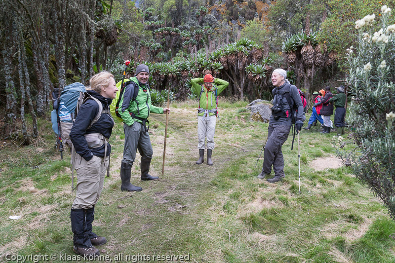 Diese vier (Karen, Rüdiger, Bela, Deb, v.l.) wollen schon heute zur Guy Yeoman Hütte absteigen. Die liegt zwar rund 600m tiefer und verspricht deshalb bessere Erholung, aber vorher muss man noch den 4280m hohen Freshfield-Pass überwinden. Ein Spaß wird das eher nicht - weder heute noch morgen...