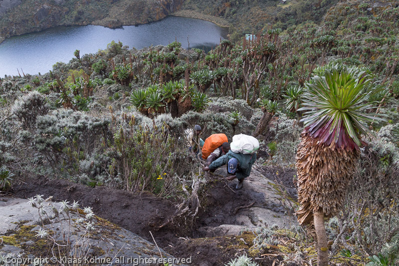 Happy 2014! Nach etwas unorthodox verbrachter Sylvesternacht (seitdem existiert der Begriff "Rumwenzori") sind wir unterwegs zum Freshfield-Pass. Ich kenne das Gelände ja schon von gestern. Überraschenderweise hat bei mir tatsächlich die Vernunft gesiegt und ich habe nur den Tagesrucksack auf den Schultern. Dafür freut sich jetzt vermutlich ein junger Träger über die zusätzliche Verdienstmöglichkeit.