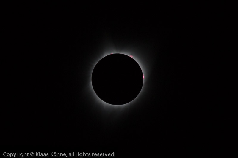 Von Westen rast der Mondschatten heran und innerhalb von ein paar Sekunden wird es dunkel, wie bei einem Dimmer. Und am Himmel steht die schwarze Mondscheibe, umrahmt von der leuchtenden Sonnenkorona. Ich erlebe das Schauspiel nach 1999 und 2006 zum dritten Mal, und es ist wieder unvergleichlich schön und beeindruckend! Drei rote Protuberanzen sind zu erkennen, so nennt man die Gasausbrüche am Sonnenrand.