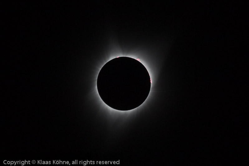 Ich starte eine Belichtungsserie. Je länger die Belichtungszeit ist, desto mehr tritt die Korona in Erscheinung. Die Protuberanzen werden dabei leider zunehmend überstrahlt.